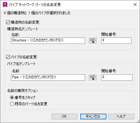 [パーツ名を変更]をクリックしますパイプだけ、構造物だけ、または両方の名前/番号を変更できます。