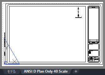 平面図作成テンプレートで使用するレイアウトに名前を付ける場合、ビューポイントで使用する尺度係数をレイアウト名に追加すると便利です。次の図では、ビューポートで使用する尺度係数を含むレイアウト名の例を示しています(ANSI D 平面図のみ: 尺度 40)。