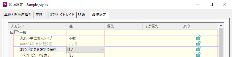 - [環境設定]タブをクリックし、[一般]プロパティを展開します。[コマンド変更を設定に保存]プロパティを[はい]に設定します。
