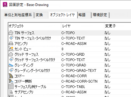 処理を高速化するには、オブジェクトを含むレイヤをフリーズするかオフにします。既定では、設計オブジェクトとそのラベルは複数のレイヤに割り振られます。たとえば、図 5 に示すように、線形、縦断、およびその他の道路設計オブジェクトは C-ROAD で始まる多くのレイヤに振り分けられます。道路設計オブジェクトをより少ないレイヤに集約した場合、それらを簡単に表示/非表示にできます。
