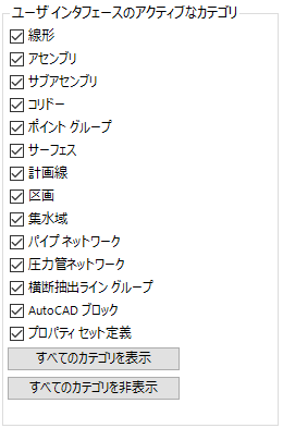 Project Explorer で特定のタスクを実行するときに、Project Explorer ウィンドウ内で使用されていない Civil 3D オブジェクト カテゴリを無効または非表示にすることが望ましい場合があります。