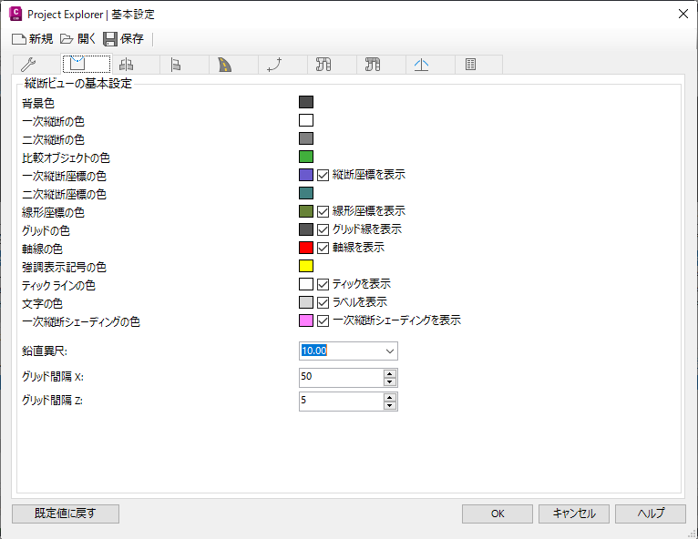 Project Explorer の[基本設定]ウィンドウの残りの 5 つのタブは、メインの Project Explorer ウィンドウにあるさまざまな縦断ビューと横断ビューの色、スタイル、グリッド、および尺度の設定をコントロールします。