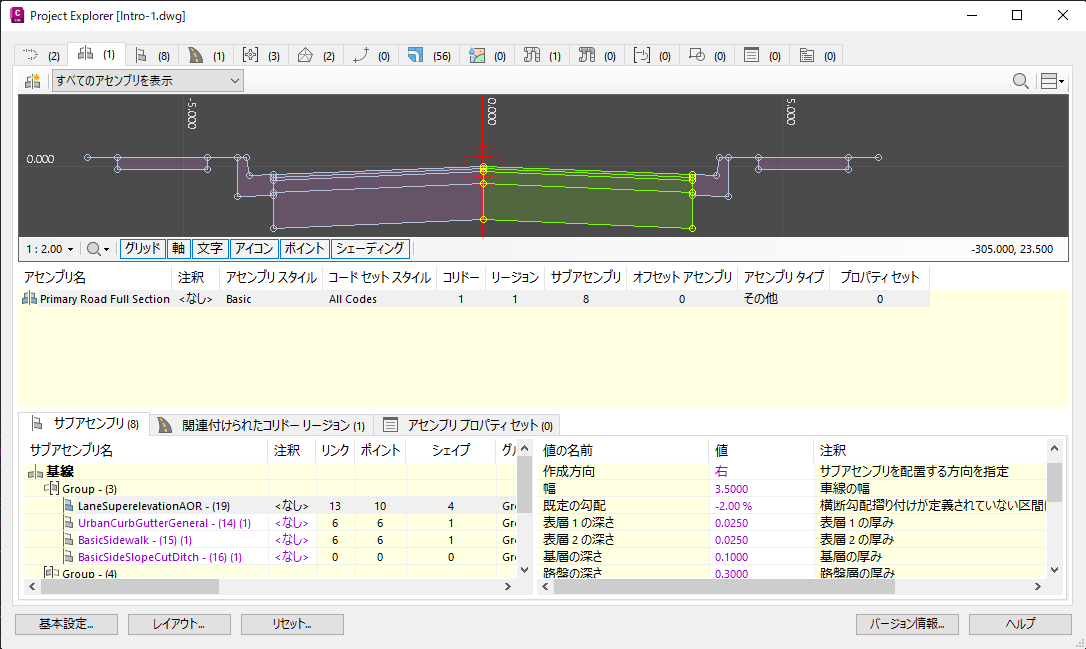 - このアセンブリのサブアセンブリ リストで、LaneSuperelevationAOR - (19)を選択します。