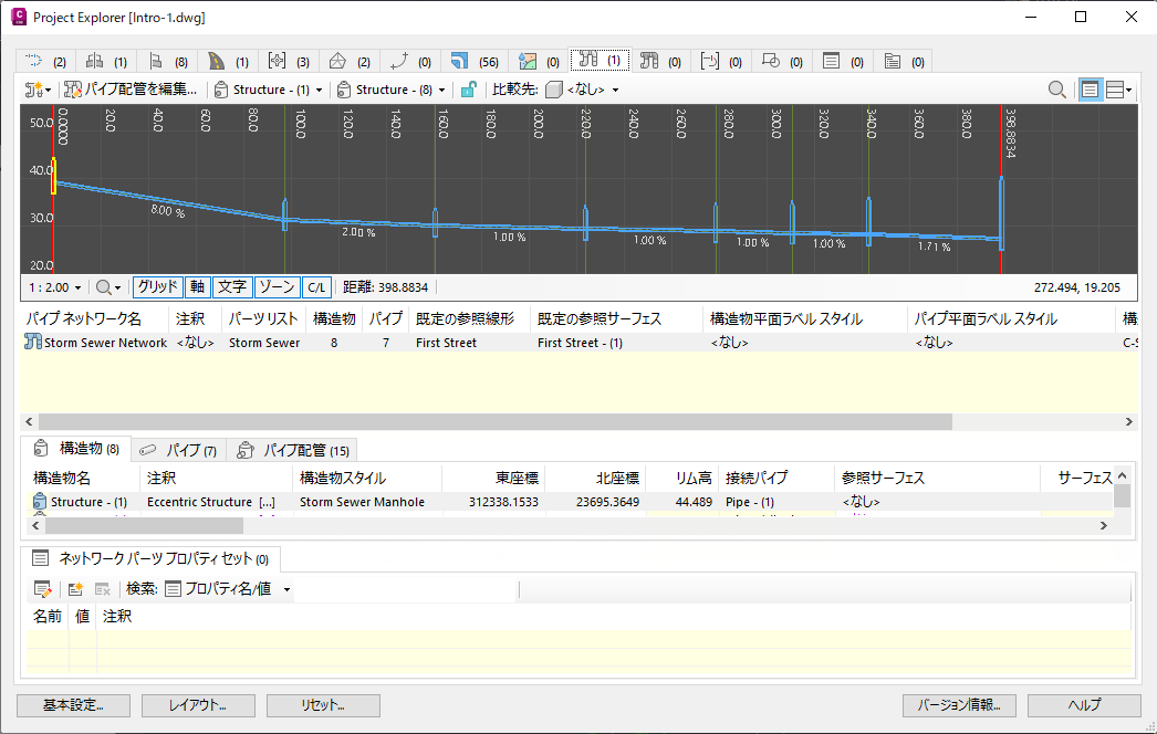 Project Explorer を使用すると、1 回の操作でパイプ配管全体の勾配を調整できます。次の操作を試してみましょう。
