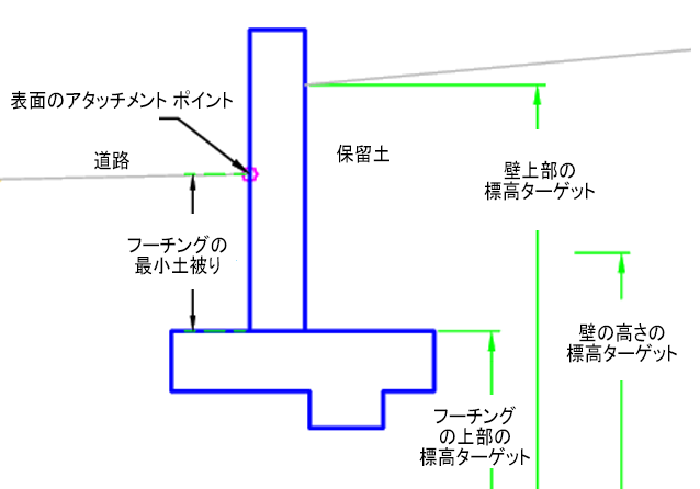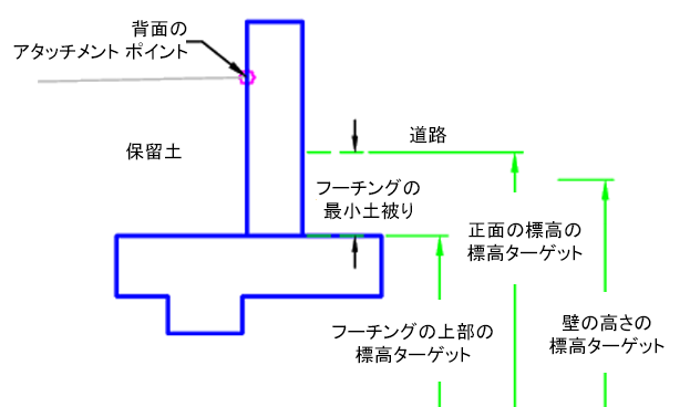 フーチングの最小土被り | 背面の場合、[正面の標高]の標高ターゲットが設定されていない場合、このパラメータはフーチングよりも上の高さを指定します。 | 数値、正 |
