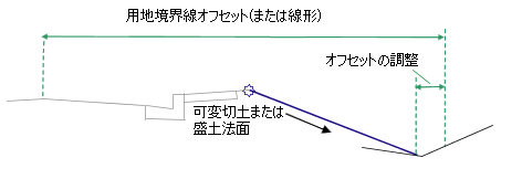 用地境界線オフセットに追加する +/- 値。負の値を設定すると、法面展開ポイントは用地境界線の内側に移動し、正の値を設定すると、用地境界線の外側に移動します。 |
