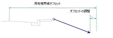 [用地境界線オフセット]の固定値を変更し、用地境界線オフセットとオフセット線形を繋ぐ場合に使用します。オフセットを指定するターゲットとして、線形、ポリライン、計画線、および測量図形の各オブジェクト タイプが使用できます。 |