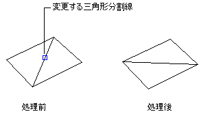 エッジのスワップは、サーフェスにある 2 つの三角形の面の方向を変更するために使用します。これにより、より一層正確な地形サーフェスを作成することができます。たとえば、三角形のエッジを尾根や谷に合わせるためにエッジをスワップできます。