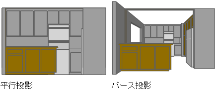 次の図は、同じモデルを平行投影とパース投影の両方で表したものです。どちらの図も、同じ視線方向に基づいています。