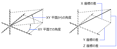 指定した 2 つの点の関係に関する情報を取り出すことができます。 たとえば、点の距離や、XY 平面での角度などが分かります。