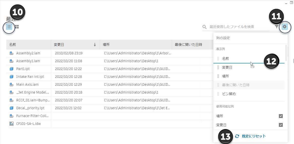 11. [環境設定]ボタンをクリックして、列の設定と内容にアクセスします。[名前]と[ピンで固定]の列は固定されています。[iProperty]の値を表示する列を追加することができます。[設定]は、[リスト ビュー]でのみ使用できます。