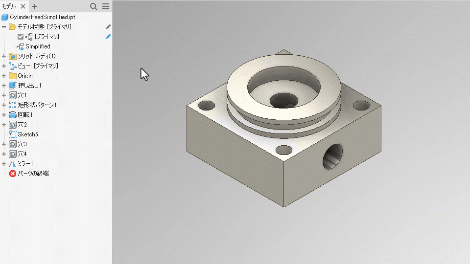 パーツ ファイルにモデル状態を作成し、フィーチャを省略して、簡略化モデルを作成します。これは、シミュレーションおよび解析のために役立ちます。