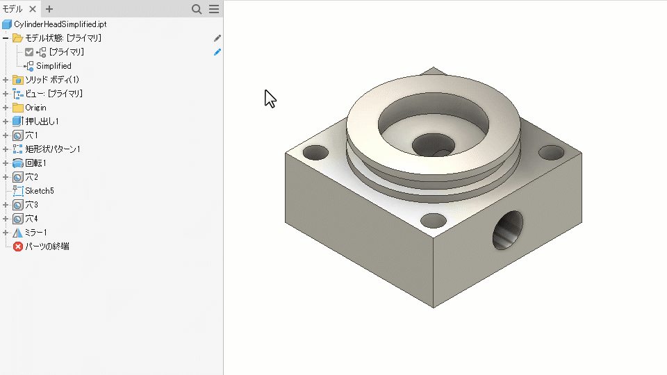 パーツ モデル状態を使用して、製造プロセスをキャプチャしたり、パーツの簡略化バージョンを作成したり、パーツのファミリを作成することができます。