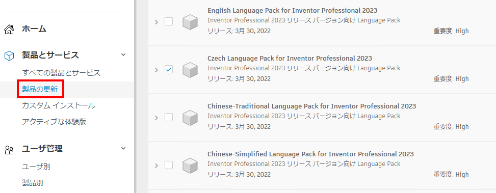 または、左ペインで}[製品の更新]に移動し、インストールする Language Pack を選択します。
