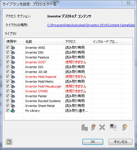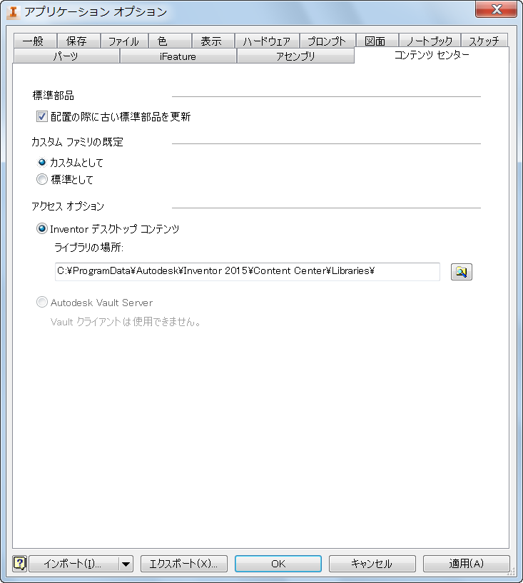 Inventor デスクトップ コンテンツの既定の場所は、C:¥ProgramData¥Autodesk¥Inventor <バージョン番号>¥Content Center¥Libraries フォルダまたは C:¥Documents and Settings¥All Users¥Application Data¥Autodesk¥Inventor <バージョン番号>¥Content Center¥Libraries フォルダです。この既定の場所は、[アプリケーション オプション]の[コンテンツ センター]タブで変更できます。次の図を参照してください。