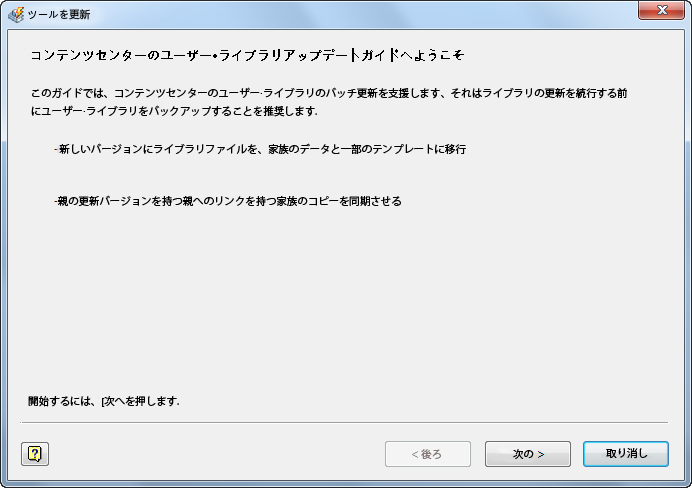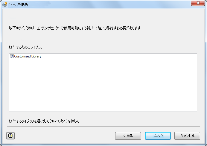 手順 3: [更新ツール]ダイアログ ボックスで、[次へ]をクリックしながら、カスタム ライブラリをマイグレーションするための手順を最後まで進めます。