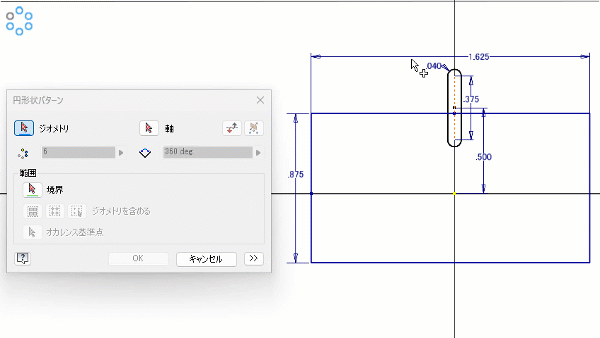 スケッチされた境界を使用し、その境界内でのみパターン スケッチ ジオメトリを使用できるようになりました。どのジオメトリをパターンに使用するかは、境界内のみ、境界内に図心を持つすべてのジオメトリ、または境界内に基点を持つすべてのジオメトリが使用される基点を使用して決定します。