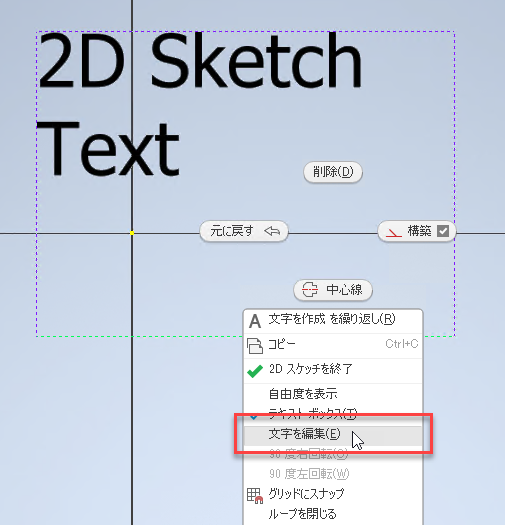 パーツとアセンブリのスケッチでは、文字を直接編集できます。最初に、点または線に関係なく、境界ジオメトリを選択します。次に、右クリックして[文字を編集]または[領域を編集]を選択します。