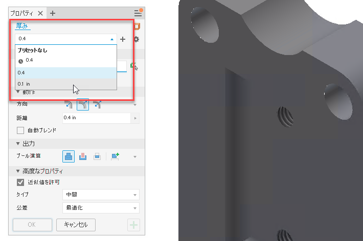 [厚み/オフセット]コマンドに、プリセットを定義する機能が追加されました。設定値を使用して独自のプリセットを指定することができます。