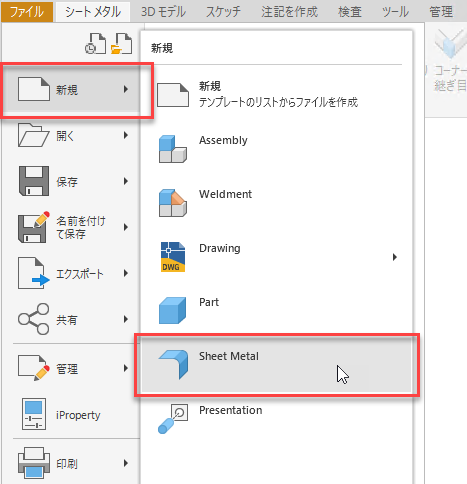[ファイル] > [新規作成]メニューからのシート メタルへのアクセス