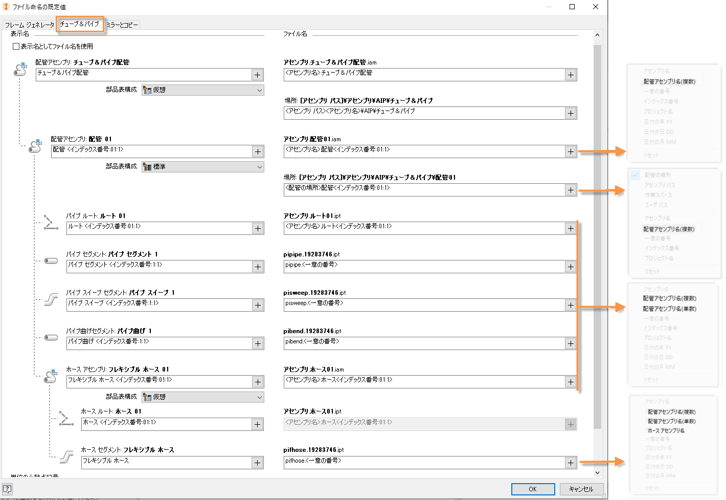 配管アセンブリ ファイル名を手動で定義する際に、子コンポーネントに新しい属性を使用して、ファイル名を継承します。
