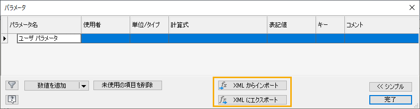 リボン コマンド、[管理]タブ パラメータ パネル、[XML からインポート]および[XML にエクスポート]が[パラメータ]ダイアログ ボックスからもアクセスできるようになりました。