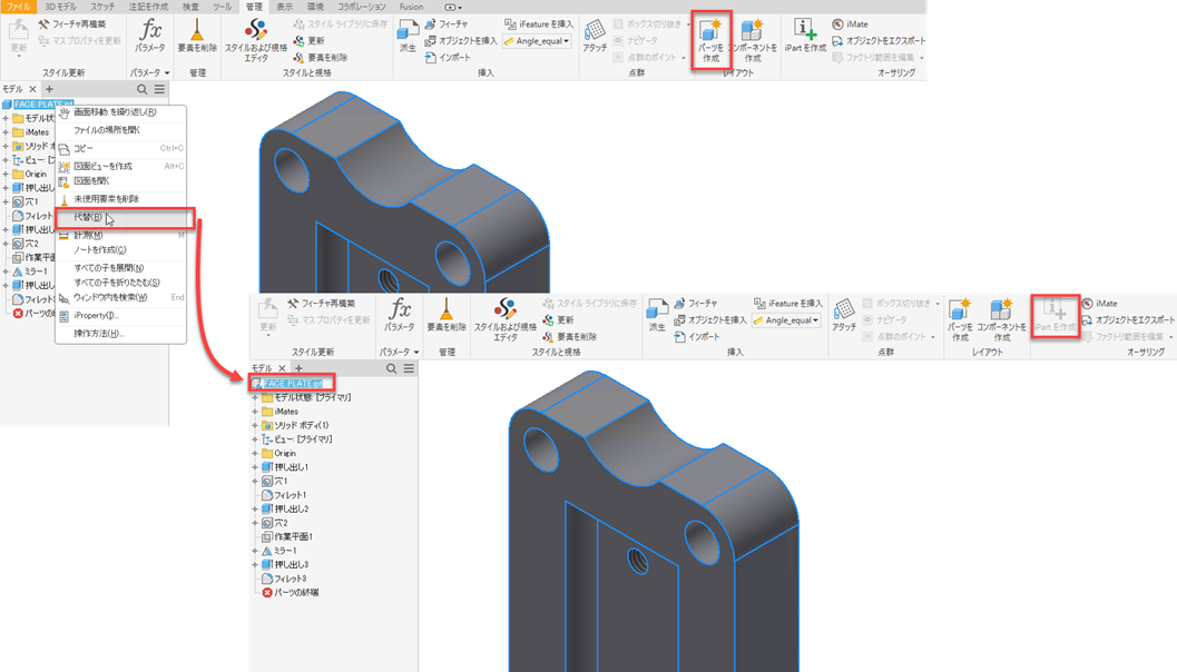 [パーツ ブラウザ]ノードのコンテンツ メニューから[代替]オプションを使用します。[パーツ ブラウザ]ノードには代替パーツのステータスが反映され、[iPart を作成]コマンドは無効になります。
