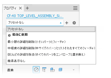 新しい[簡略化]コマンドは、[シュリンクラップ]コマンドと[シュリンクラップ代替]コマンドの両方に代わるものです。[簡略化]を使用すると、複雑なアセンブリからコンポーネントやフィーチャが削除され、コラボレーションや後工程での使用を容易にすることができます。