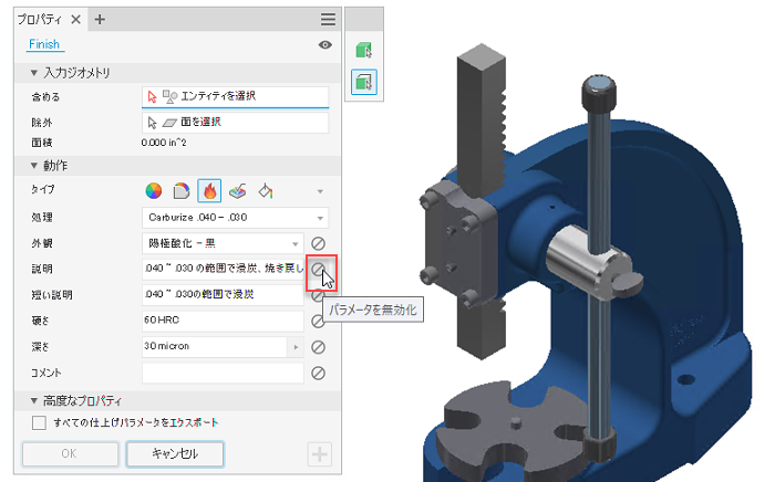 任意の[仕上げ]パラメータを無効化または削除できるようになりました。パラメータを無効にするには、その横にある[パラメータを無効にする]ボタンを選択します。パラメータを無効にすると、対応するエントリは[パラメータ]テーブルに作成されません。無効なフィールドに関連付けられた既存のパラメータは、[パラメータ]テーブルと[iComponent]テーブルの両方から削除されます。