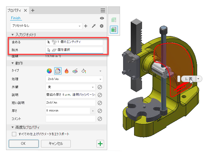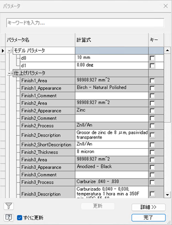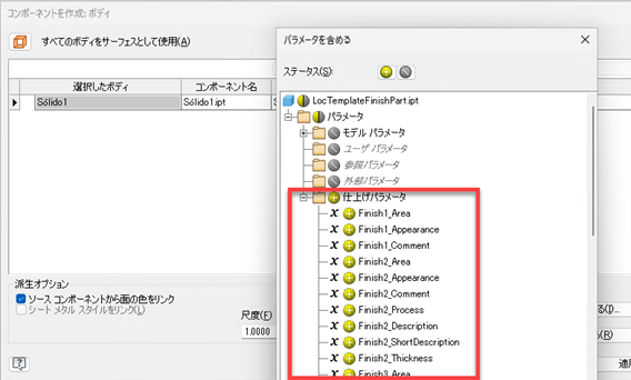 パーツでは、[派生]コマンドおよび[パーツを作成]コマンドを使用するときに、外観、仕上げ、仕上げパラメータをターゲット ドキュメントに派生できるようになりました。[仕上げ]を含めると、そのすべてのパラメータが自動的に含まれます。逆に、[仕上げ]を除外すると、そのすべてのパラメータが自動的に除外されます。なお、省略された仕上げを派生することはできません。
