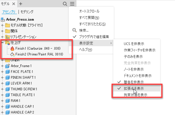 ブラウザの[表示設定]ドロップダウン メニューの[拡張名を表示]オプションを使用して、次の仕上げタイプのフィーチャ ノード名の後に拡張情報を表示します。
