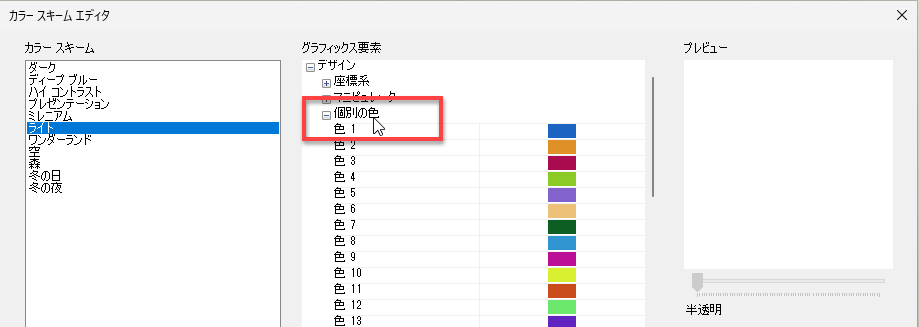 カラー スキーム エディタのカラー リストをカスタマイズできるようになりました。新しく設けられた[個別の色]セクションにオプションが追加されました。