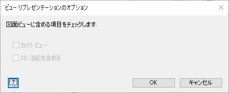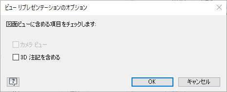 投影ビューを作成または編集するときに、[ビュー リプレゼンテーションのオプション]ダイアログ ボックスが表示されます。[カメラ ビュー]オプションは、ベース ビューと投影ビューの関係を維持するために無効になっています。