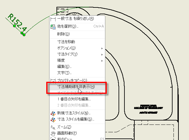 直径寸法と半径寸法に新しいオプションが追加され、寸法補助線を非表示にできるようになりました。この機能を使用するには、寸法補助線を選択して右クリックし、[寸法補助線を非表示]を選択します。