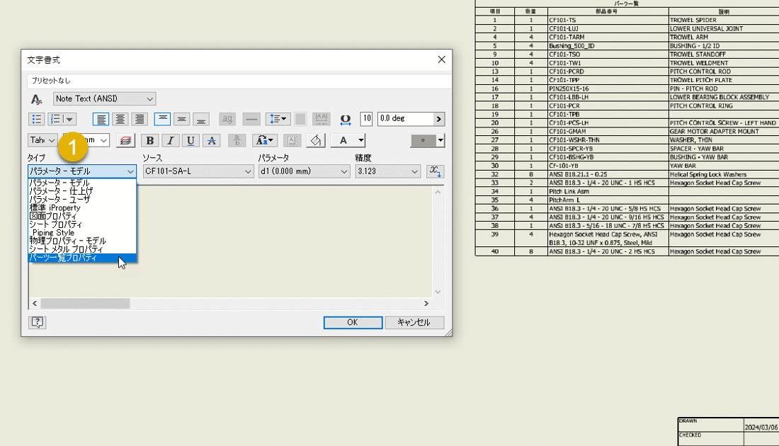 [テキスト]ダイアログに、[パーツ一覧]プロパティを任意の図面テキストに追加する機能が追加されました。