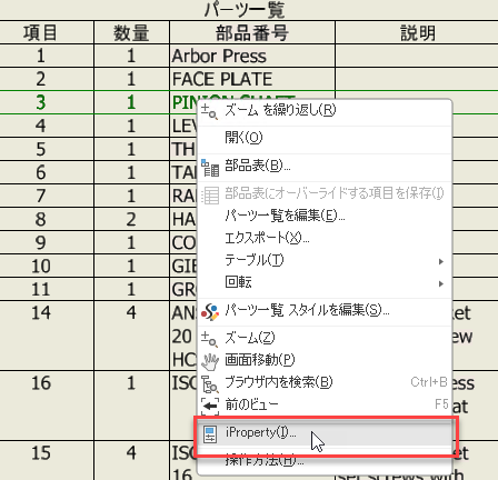 パーツ一覧からコンポーネント プロパティを編集する操作が簡単になりました。コンポーネント行を選択して右クリックし、[iProperty]を選択します。