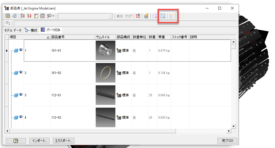 [部品表]ダイアログ ボックスが再設計されました。2 つのオプションがツールバーに直接追加され、数量がゼロの項目を表示または非表示にできるようになりました。ツールバーの新しい [数量ゼロの行を表示/非表示] の切り替えを使用します。アクティブな場合、新しい [順次自動再番号付け] 切り替えを使用して順次番号付けすることもできます。