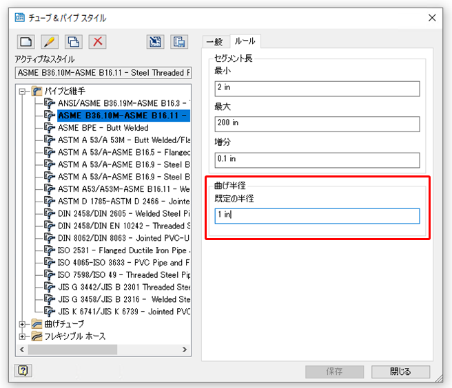 これで、すべての既定の[曲げ半径]値が、書き出された[チューブ & パイプ スタイル]に保存されます。[T&P スタイル]の曲げ半径は XML ファイルに書き出すことができ、読み込むことも可能です。