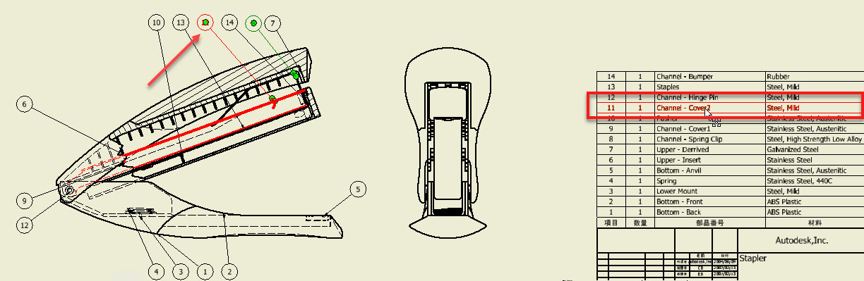 パーツ一覧の行を 1 つまたは複数選択すると、対応するバルーンがハイライト表示されます。バルーンのハイライト表示の連動により、選択したパーツ一覧行に対応するバルーンを簡単に見つけることができ、バルーン化された成形品の形状を簡単に特定できます。