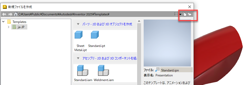 [ファイルを新規作成] ダイアログを使用して、テンプレート ファイルにアクセスしやすくなりました。右上に次の 2 つのオプションが追加されています。
