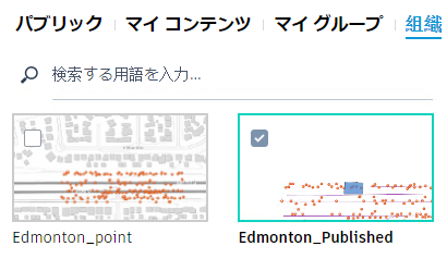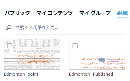 - [パブリック]、[マイ コンテンツ]、[マイ グループ]、および[組織]の各フィルタを使用して、選択した対象区域で使用可能なデータセットを参照します。