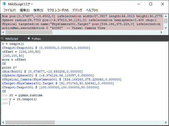 プロンプトで示されます。詳細については、3ds Max Python ヘルプを参照してください。[スクリプト リスナー](Scripting Listener)ウィンドウは、インタラクティブな作業を実行する場合や小さなコードを開発する場合に適しています。大きなコード ブロックは、[スクリプト エディタ](Scripting Editor)ウィンドウで開発する必要があります。