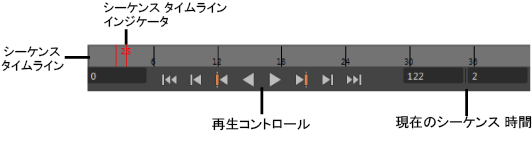 カメラ シーケンサ(Camera Sequencer)のタイムラインにはシーケンス時間が表示されます。シーケンス タイムラインの垂直の赤いインジケータをドラッグすると、現在のシーケンス時間が変わり、それに従って Maya のメイン ビューが更新されます。再生コントロールを使用してシーケンス時間を変更することもできます。