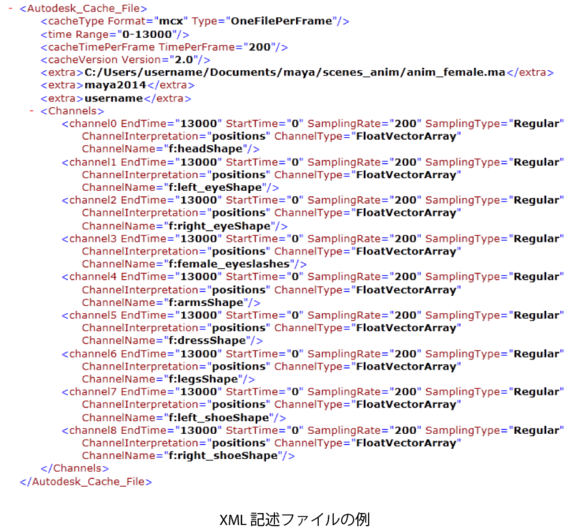 ジオメトリ キャッシュを作成すると、キャッシュは .mcx または .mcc (Maya キャッシュ)ファイルとしてディスクに保存されます。キャッシュには、.xml ディスクリプション ファイルも生成されます。XML (eXtensible Markup Language)ディスクリプション ファイルには、ジオメトリ キャッシュされたオブジェクトやキャッシュのタイム レンジなどその他の便利な情報のデータ ファイルを見つけるために Maya が使用する重要なキャッシュ アトリビュートのリストが含まれています。XML ディスクリプション ファイルは、ジオメトリ キャッシュ ファイルとそれに接続されたオブジェクトやシーンの追跡に使用できます。