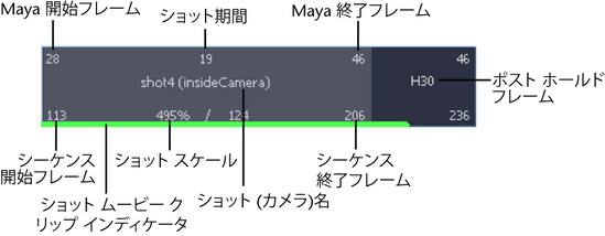 各グループに 1 つずつアクティブ ショットがあります。シーケンス時間の表示(View Sequence Time)モードを選択した場合、アクティブ ショットがシーン ビューに描画されます。このショットでオーディオ ノードの指定(このショットに接続されている場合)やグループを描画する長さの定義を行います。グループ ノードにはこのショットの名前が表示されます。グループの作成時、既定では、アルファベット順の最初のショットがアクティブ ショットになります。