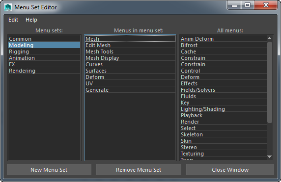 メニュー セットを既定の状態に復元します。このオプションは、メニュー セット(Menu Sets)列で現在選択されているメニュー セットが既定のメニュー セット(モデリング(Modeling)、リギング(Rigging)、アニメーション(Animation)、Fx(FX)、レンダリング(Rendering))のいずれかである場合に使用できます。