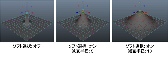 ソフト選択(Soft Selection)では、選択したコンポーネントから選択範囲の周りのコンポーネントへの減衰を維持することにより、スムーズなトランジションを行うことができます。