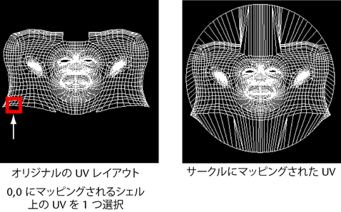 選択した UV は重要です。これによって、UV シェルが UV テクスチャ空間の原点 0,0 にマッピングされる位置が定義されます。結果として得られた UV 境界マッピングが歪んで表示される場合は、これを元に戻し、もう一度選別の UV とマップを選択します。