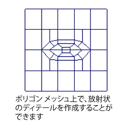 エッジ ループのオフセット ツール(Offset Edge Loop Tool)は、エッジの削除(Delete Edge)オプションがオンのときにエッジ ループのオフセット ツール(Offset Edge Loop Tool)が 4 辺トポロジを維持する方法に基づいて、オリジナルのメッシュよりもっと放射状に、エッジ選択の範囲に応じてエッジを挿入します。この放射状のディテールは、キャラクタモデルの眼、耳、または口などの部分の作成に役立ちます。