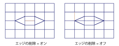 内部エッジ ループの一部分のエッジをオフセットするときに、ループの両端に作成される新しいポリゴンが 3 辺である場合があります。エッジの削除(Delete edge)をオンにすると、ループの開始エッジと終了エッジが、メッシュ上の 4 辺トポロジを維持するために削除されます。ツールの終了 - 自動(Tool Completion - Automatically)オプションがオンのときは、エッジの削除(Delete Edge)オプションは使用できません。